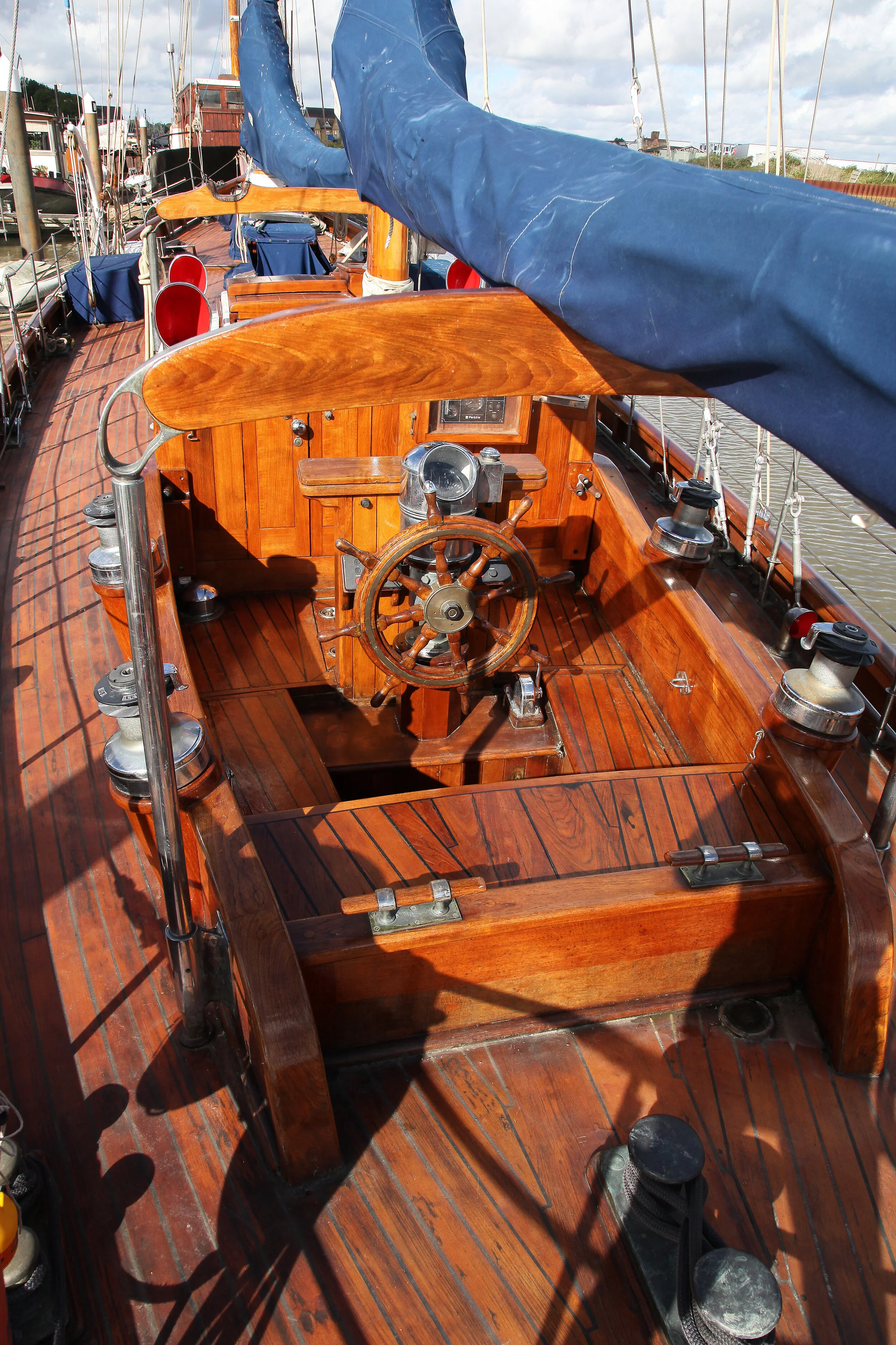 From aft: Mizzen boom gallows. 2 x Panama fairleads thru bulwark leading to stout centreline galvanised double bollard. Deep cockpit with wheel steering. 4 x Self tailing chromed sheet winches. Mizzen mast and deckhouse immediately forward. 4 x Large ventilation cowls on deckhouse roof. Companionway in deckhouse to engine room. Main boom gallows at fwd deckhouse Butterfly skylight to aft stateroom. Dorade boxes and cowls port and starboard Raised companionway to accommodation Laurent Giles style running backstay levers port & starboard Butterfly skylight to saloon. Tender stowage over Panama spring line fairleads thru bulwark port & starboard leading to galvanised double bollards.