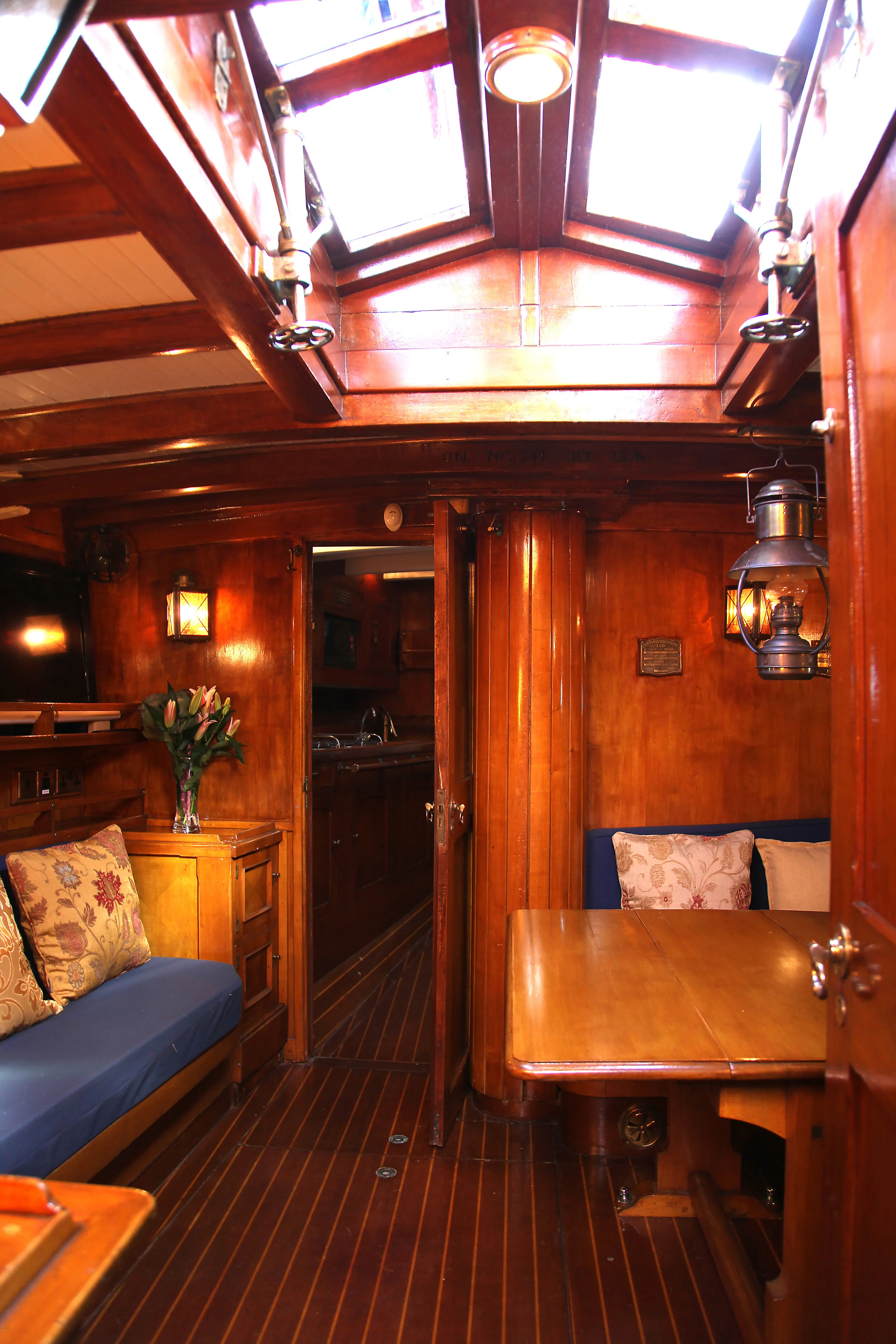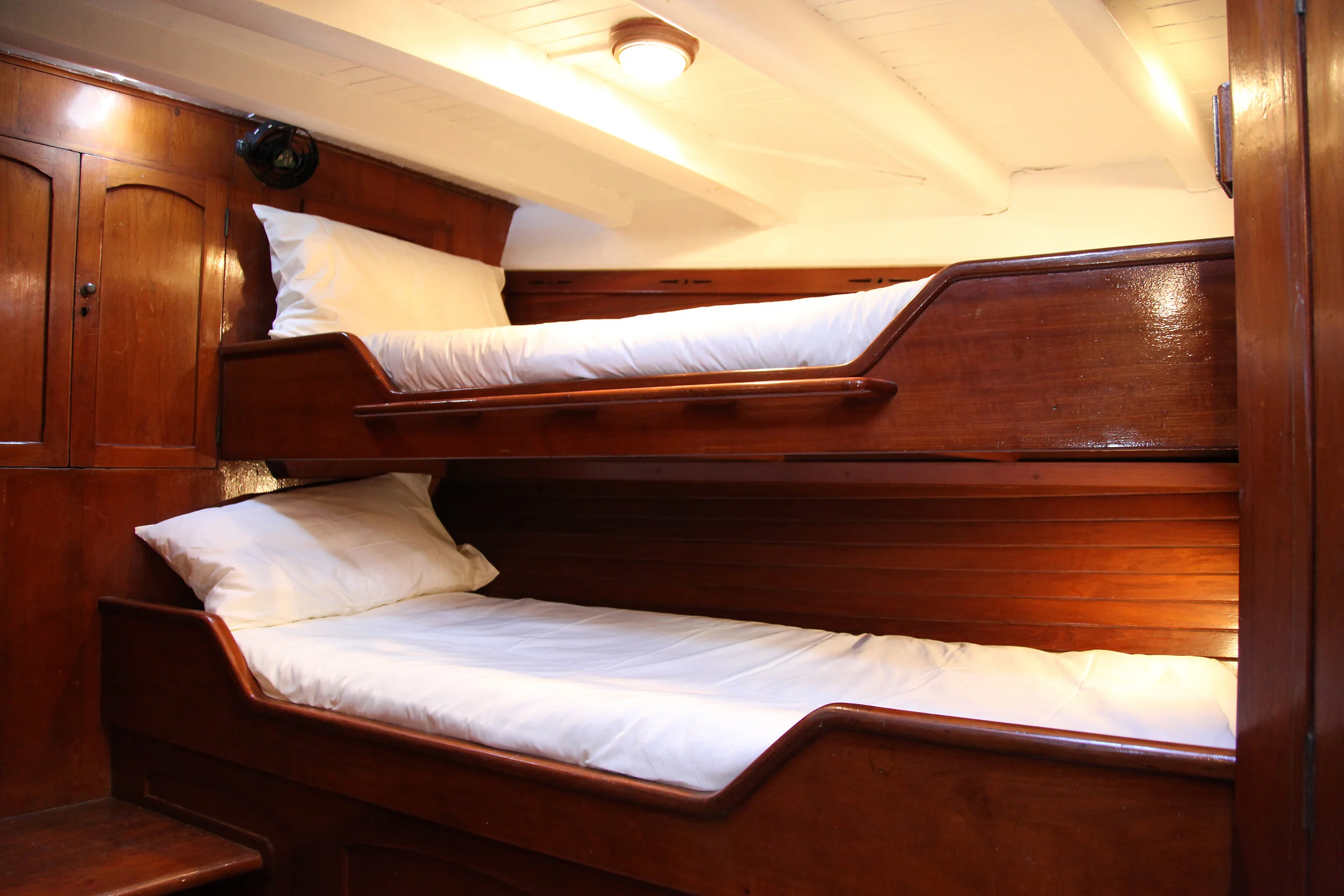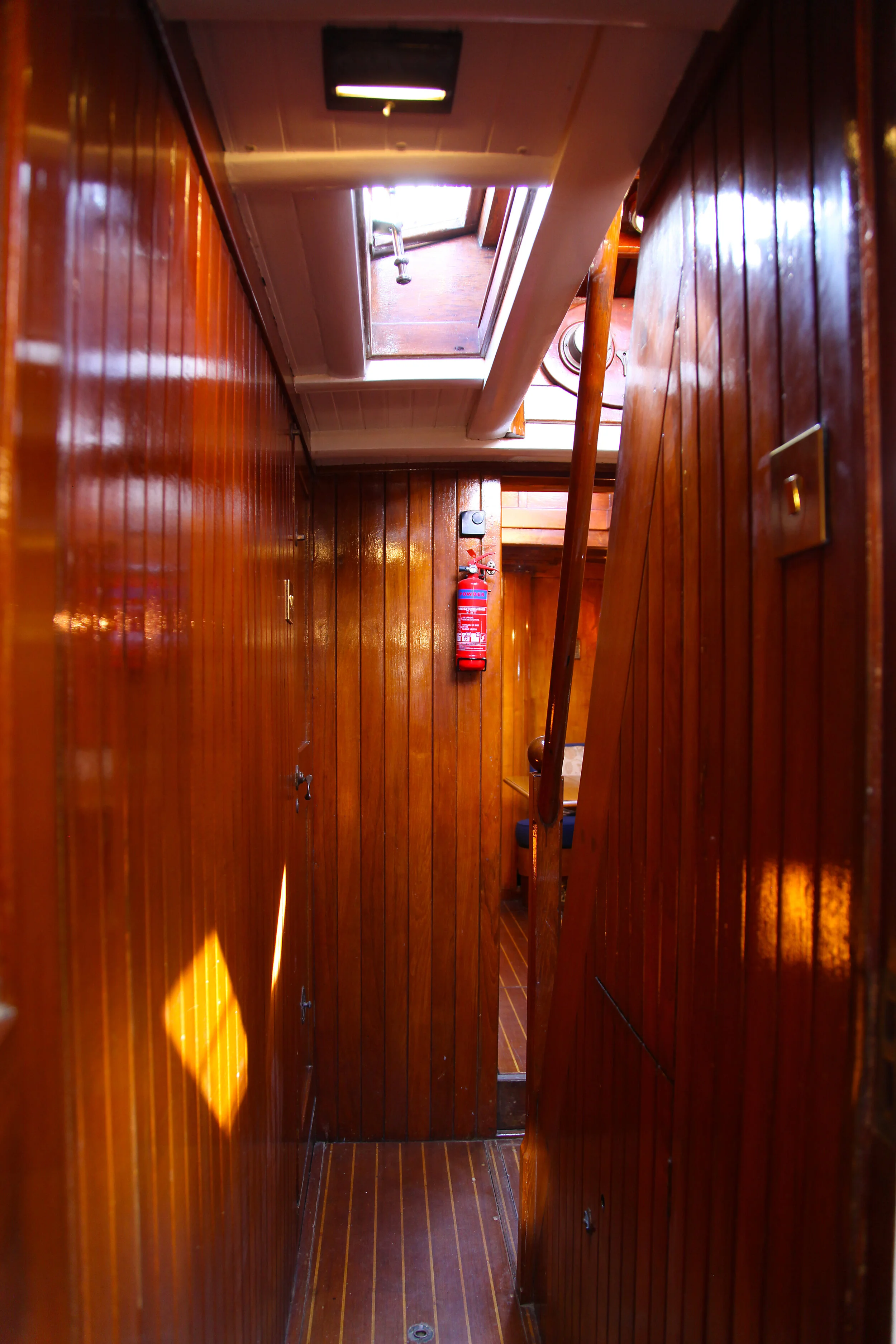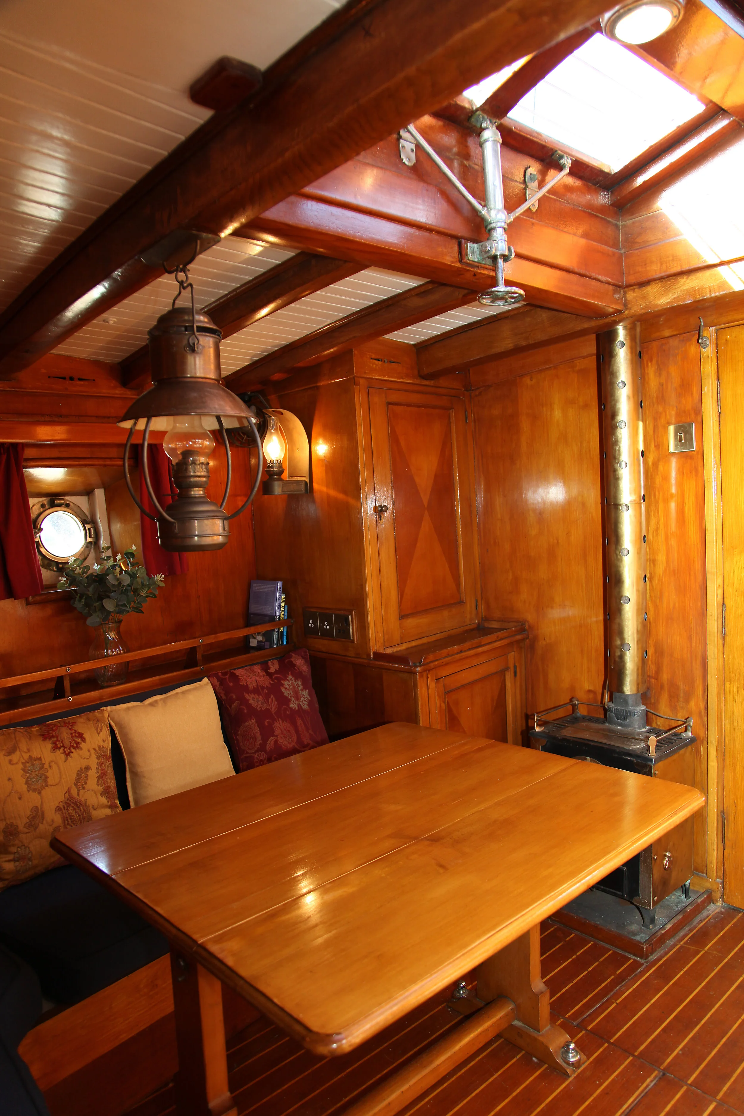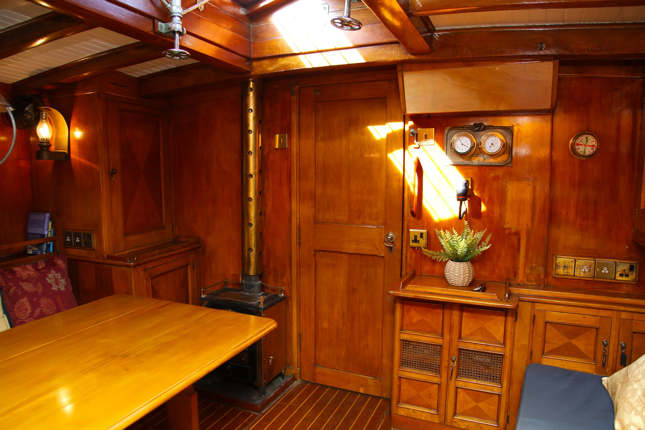 - ACCOMMODATION AND DOMESTIC EQUIPMENT - Cabins: 8 x berths in 3 x cabins. Natural light comes from 5 x topside opening ports each side. Entry from companionway forward of deckhouse Aft master cabin: 4 x berths (2 x double). Stowage under. Dresser and large mirror on aft bulkhead. Opening ports port and starboard. Blakes WC and shower. - Midships cabin: 2 x bunks. Stowage. Midships shower room with Blakes WC. - Saloon: Solid fuel stove. Chart table & navigation equipment. Flat screen TV. Drop leaf table. Settees convertible to 2 x bunks. - Galley forward: 2 x Bunks to starboard. 4 x Burner hob. Microwave oven. Fridge Waeco CoolMatic CR-110. Hot water system. Heating system. - Main mast: Self tailing halyard winches. Pin rails and running light boxes at shrouds. - Stowage boxes port & starboard. Single davit to port. Sliding track for staysail boom sheeting. - Raised companionway forehatch: Skylight in sliding part. Deadlight ports to sides. Large Dorade box with large chromed cowl vent immediately fwd. Mushroom deck vent to port over galley Substantial (hydraulic - tbc) windlass and warping drum. Dorade box and large chromed cowl vent immediately fwd of windlass. Large deck prism fwd. 2 x Panama fairleads thru bulwark leading to stout galvanised double bollards port and starboard.