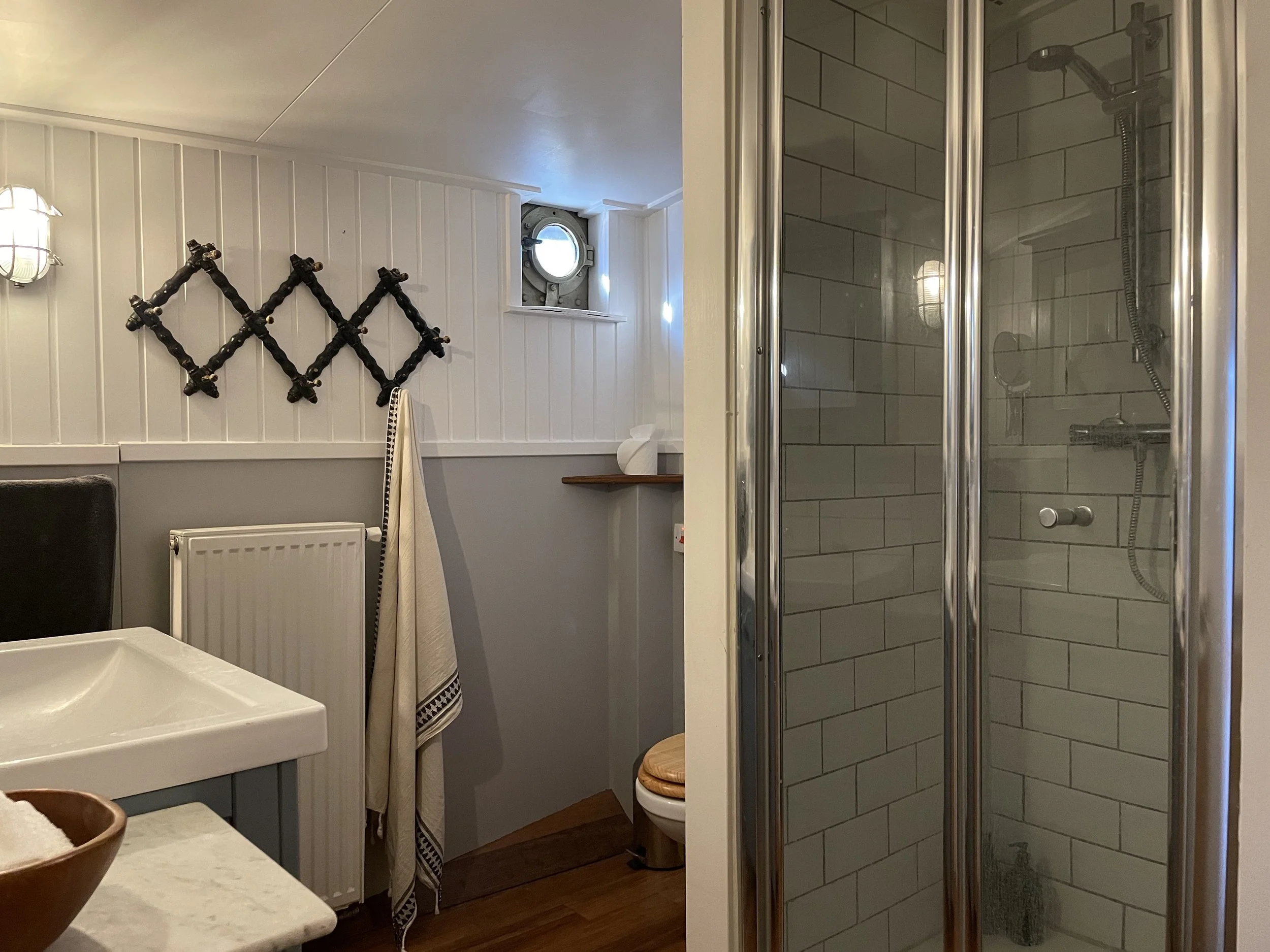 This Dutch Barge is perfect for a couple, a small family or sharers and comes with most of the furniture and is ready to move straight into and enjoy. The galley saloon is open plan and the high ceilings in the midships with exposed steel trusses add to the spacious feel. The interior has been tastefully modernised with a material palette that is bright and inviting, the rooms are charming and cosy and the master cabin is characterfully decorated. Marine details are noticeable throughout with hardwood ships doors with porthole details, brass ironmongery, traditional ships wall lights, wood panelled walls, opening roof lights and brass portholes. The living area is light in the summer and cosy in the winter with the warmth of the wood burner and central heating throughout. The galley island is flooded with light from an opening roof light and comfortably accommodates 4 high backed stools.
